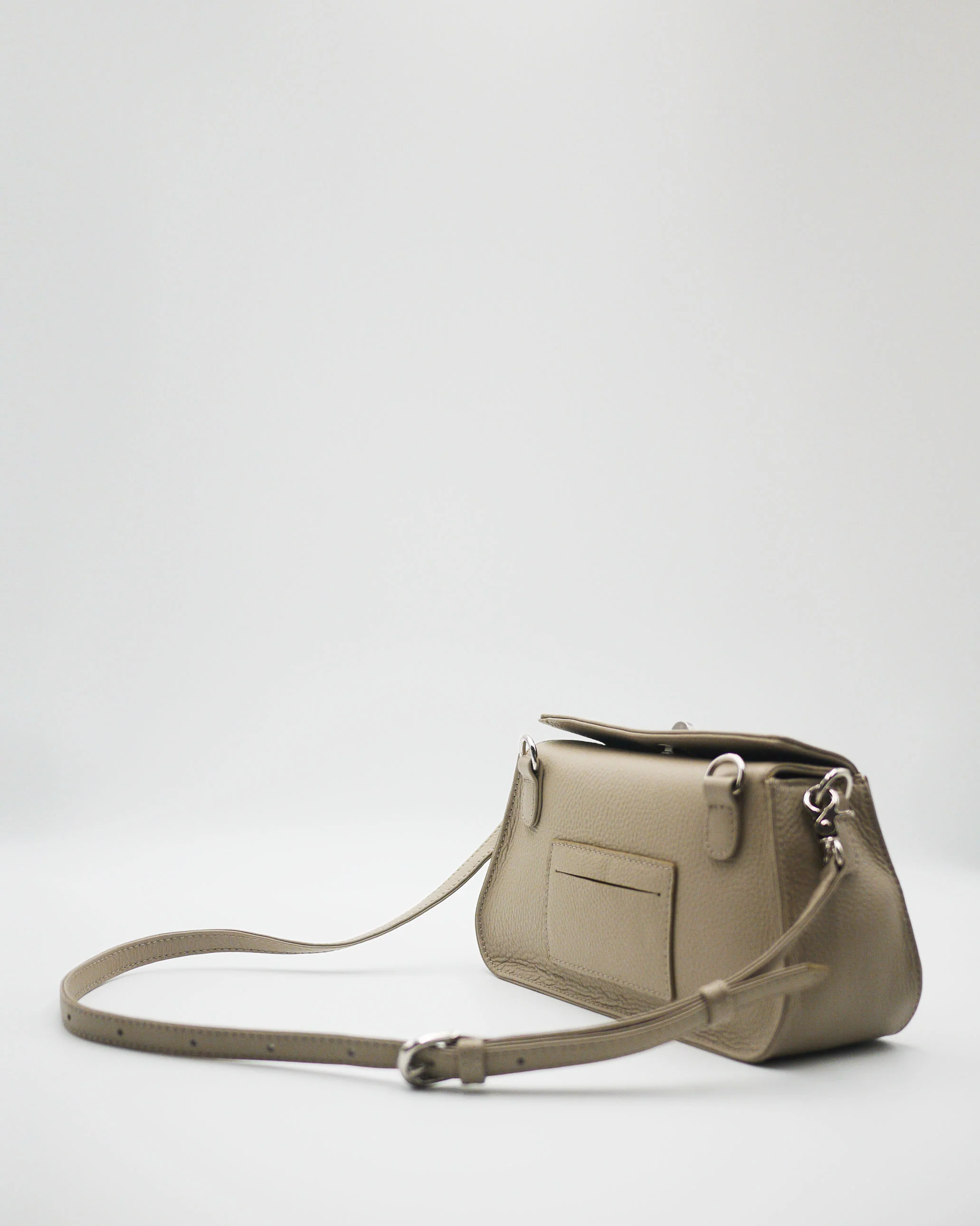 The Treasure is a sleek, trapezoid-shaped bag designed to carry your essentials like a SPF lip balm, a mini first aid kit, your phone, and wireless earbuds. Its adjustable strap allows for easy conversion between a belt bag and an underarm shoulder bag, giving you the flexibility to be hands-free. The flap top opens to reveal a structured single compartment with an additional pocket for extra storage and secures with a logo-engraved metal turnlock. The back exterior features a convenient card slot that fits transit passes from most countries.